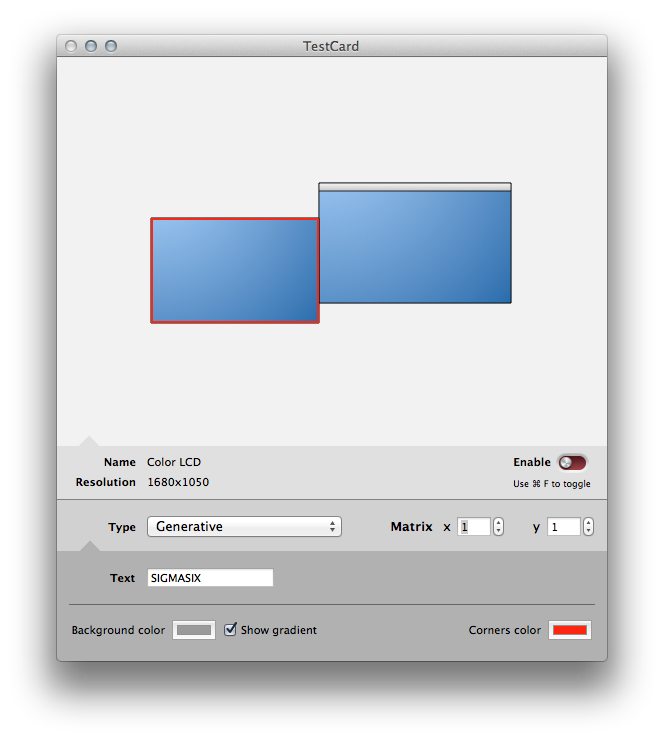 The TestCard app is a small tool to display pixel perfect test patterns on any connected display. The default test pattern is a custom made design that suits your needs to caliber any type of display or video projectors. You can use it to check the position and distortion, and also colors, grays, contrasts and interlacing.